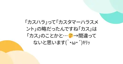 「カスハラ」って「カスタマーハラスメント」の略だったんですね「カス」は「カス」のことかと…🤔→間違ってないと思います(`・ω・´)キリッ