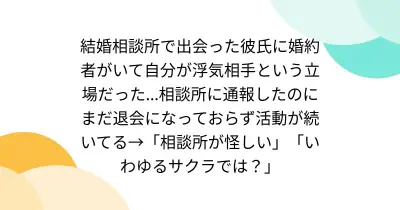 結婚相談所で出会った彼氏に婚約者がいて自分が浮気相手という立場だった...相談所に通報したのにまだ退会になっておらず活動が続いてる→「相談所が怪しい」「いわゆるサクラでは?」