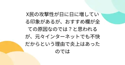 X民の攻撃性が日に日に増している印象があるが、おすすめ欄が全ての原因なのでは?と思われるが、元々インターネットでも不快だからという理由で炎上はあったのでは
