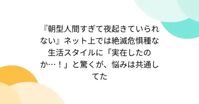 『朝型人間すぎて夜起きていられない』ネット上では絶滅危惧種な生活スタイルに「実在したのか…!」と驚くが、悩みは共通してた