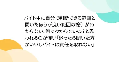 バイト中に自分で判断できる範囲と聞いたほうが良い範囲の線引がわからない、何でわからないの?と思われるのが怖い「迷ったら聞いた方がいいしバイトは責任を取れない」