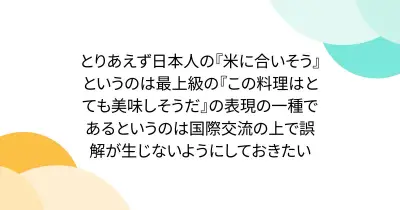 とりあえず日本人の『米に合いそう』というのは最上級の『この料理はとても美味しそうだ』の表現の一種であるというのは国際交流の上で誤解が生じないようにしておきたい