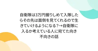自衛隊は3万円握りしめて入隊したらその先は面倒を見てくれるので生きていけるようになる?→自衛隊に入るか考えている人に宛てた向き不向きの話