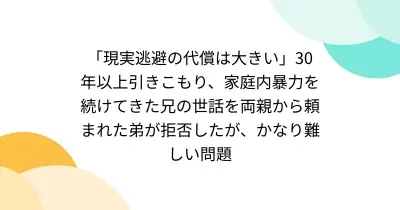 「現実逃避の代償は大きい」30年以上引きこもり、家庭内暴力を続けてきた兄の世話を両親から頼まれた弟が拒否したが、かなり難しい問題