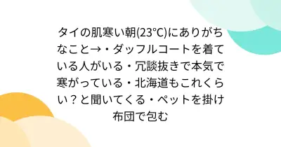 タイの肌寒い朝(23℃)にありがちなこと→・ダッフルコートを着ている人がいる・冗談抜きで本気で寒がっている・北海道もこれくらい?と聞いてくる・ペットを掛け布団で包む