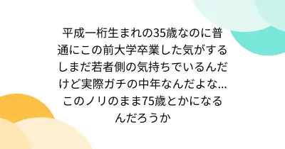 平成一桁生まれの35歳なのに普通にこの前大学卒業した気がするしまだ若者側の気持ちでいるんだけど実際ガチの中年なんだよな...このノリのまま75歳とかになるんだろうか