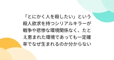 「とにかく人を殺したい」という殺人欲求を持つシリアルキラーが戦争や悲惨な環境関係なく、たとえ恵まれた環境であっても一定確率でなぜ生まれるのか分からない