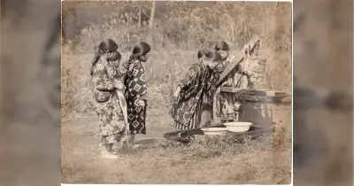 1932年撮影の古写真… おそらく「うちの村の井戸に、手押しポンプが設置されたぞ!」という記念写真で、被写体の女の子たちは多分おしゃれして写真に写りにきてる