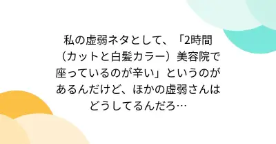 私の虚弱ネタとして、「2時間(カットと白髪カラー)美容院で座っているのが辛い」というのがあるんだけど、ほかの虚弱さんはどうしてるんだろ…