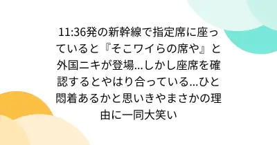 11:36発の新幹線で指定席に座っていると『そこワイらの席や』と外国ニキが登場...しかし座席を確認するとやはり合っている...ひと悶着あるかと思いきやまさかの理由に一同大笑い