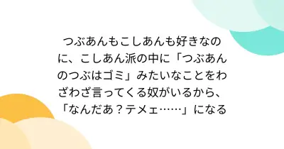 つぶあんもこしあんも好きなのに、こしあん派の中に「つぶあんのつぶはゴミ」みたいなことをわざわざ言ってくる奴がいるから、「なんだあ?テメェ……」になる