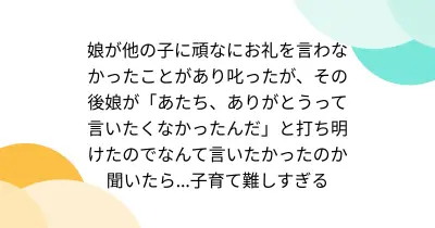 娘が他の子に頑なにお礼を言わなかったことがあり叱ったが、その後娘が「あたち、ありがとうって言いたくなかったんだ」と打ち明けたのでなんて言いたかったのか聞いたら...子育て難しすぎる