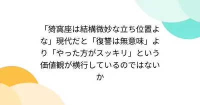 「猗窩座は結構微妙な立ち位置よな」現代だと「復讐は無意味」より「やった方がスッキリ」という価値観が横行しているのではないか
