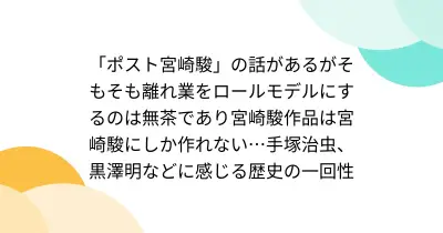 「ポスト宮崎駿」の話があるがそもそも離れ業をロールモデルにするのは無茶であり宮崎駿作品は宮崎駿にしか作れない…手塚治虫、黒澤明などに感じる歴史の一回性