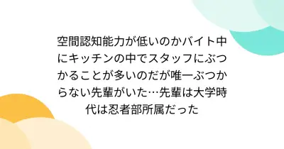 空間認知能力が低いのかバイト中にキッチンの中でスタッフにぶつかることが多いのだが唯一ぶつからない先輩がいた…先輩は大学時代は忍者部所属だった