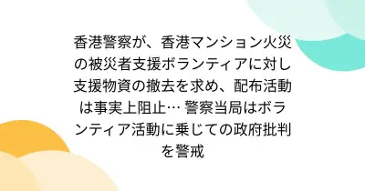 香港警察が、香港マンション火災の被災者支援ボランティアに対し支援物資の撤去を求め、配布活動は事実上阻止… 警察当局はボランティア活動に乗じての政府批判を警戒