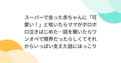 スーパーで会った赤ちゃんに「可愛い!」と呟いたらママがボロボロ泣きはじめた…話を聞いたらワンオペで限界だったらしくてそれからいっぱい支えた話にほっこり