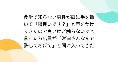 食堂で知らない男性が肩に手を置いて「隣良いです?」と声をかけてきたので良いけど触らないでと言ったら店員が「常連さんなんで許してあげて」と間に入ってきた