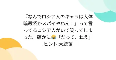 『なんでロシア人のキャラは大体暗殺系かスパイやねん!』って言ってるロシア人がいて笑ってしまった。確かに😂「だって、ねえ」「ヒント:大統領」