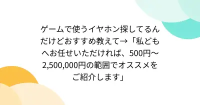 ゲームで使うイヤホン探してるんだけどおすすめ教えて→「私どもへお任せいただければ、500円〜2,500,000円の範囲でオススメをご紹介します」