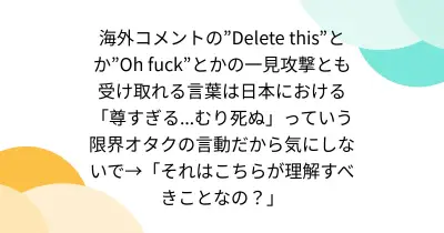 海外コメントの”Delete this”とか”Oh fuck”とかの一見攻撃とも受け取れる言葉は日本における「尊すぎる...むり死ぬ」っていう限界オタクの言動だから気にしないで→「それはこちらが理解すべきことなの?」