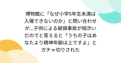 博物館に「なぜ小学5年生未満は入場できないのか」と問い合わせが...子供による破損事故が相次いだのでと答えると「うちの子はあなたより精神年齢は上ですよ」とガチャ切りされた