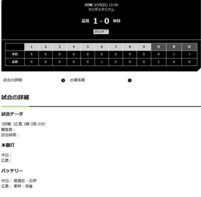 【試合結果】 3/29 中日 0-1 広島 1安打完封負けで開幕3連敗 高橋宏斗8回1失点も援護なし報われず
