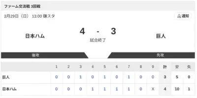 【試合結果】日本ハム2軍vs巨人 4-3|ファーム交流戦3回戦|個人成績|3/29