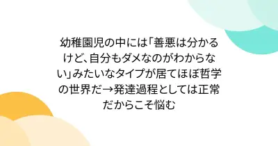 幼稚園児の中には「善悪は分かるけど、自分もダメなのがわからない」みたいなタイプが居てほぼ哲学の世界だ→発達過程としては正常だからこそ悩む