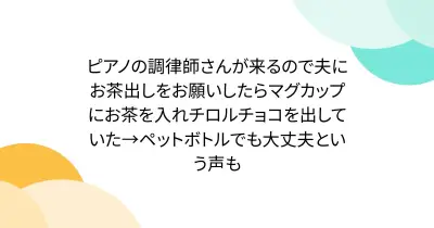 ピアノの調律師さんが来るので夫にお茶出しをお願いしたらマグカップにお茶を入れチロルチョコを出していた→ペットボトルでも大丈夫という声も