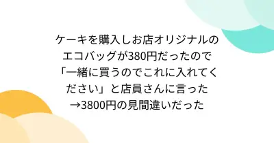 ケーキを購入しお店オリジナルのエコバッグが380円だったので「一緒に買うのでこれに入れてください」と店員さんに言った→3800円の見間違いだった