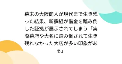 幕末の大阪商人が現代まで生き残った結果、新撰組が借金を踏み倒した証拠が展示されてしまう「実際幕府や大名に踏み倒されて生き残れなかった大店が多い印象がある」