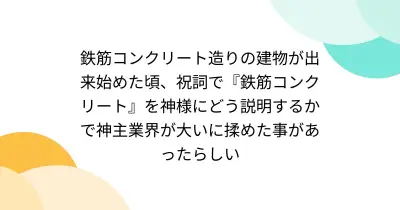 鉄筋コンクリート造りの建物が出来始めた頃、祝詞で『鉄筋コンクリート』を神様にどう説明するかで神主業界が大いに揉めた事があったらしい