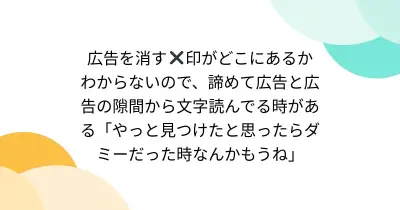 広告を消す✖️印がどこにあるかわからないので、諦めて広告と広告の隙間から文字読んでる時がある「やっと見つけたと思ったらダミーだった時なんかもうね」