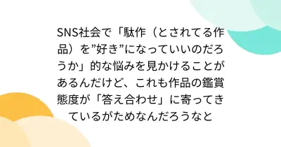 SNS社会で「駄作(とされてる作品)を”好き”になっていいのだろうか」的な悩みを見かけることがあるんだけど、これも作品の鑑賞態度が「答え合わせ」に寄ってきているがためなんだろうなと
