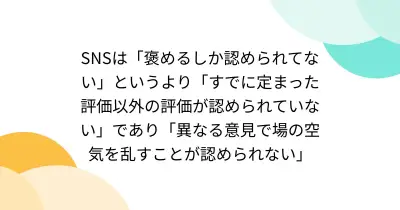 SNSは「褒めるしか認められてない」というより「すでに定まった評価以外の評価が認められていない」であり「異なる意見で場の空気を乱すことが認められない」
