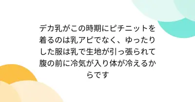 デカ乳がこの時期にピチニットを着るのは乳アピでなく、ゆったりした服は乳で生地が引っ張られて腹の前に冷気が入り体が冷えるからです