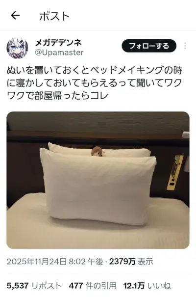 【画像】ぬい活界隈、ホテルへの迷惑行為で叩かれてしまう