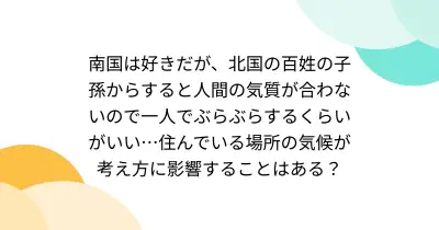 南国は好きだが、北国の百姓の子孫からすると人間の気質が合わないので一人でぶらぶらするくらいがいい…住んでいる場所の気候が考え方に影響することはある?