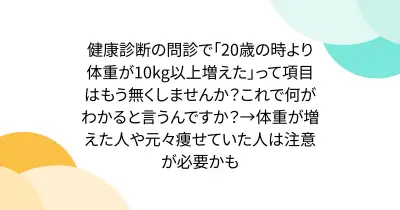 健康診断の問診で「20歳の時より体重が10kg以上増えた」って項目はもう無くしませんか?これで何がわかると言うんですか?→体重が増えた人や元々痩せていた人は注意が必要かも