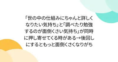 「世の中の仕組みにちゃんと詳しくなりたい気持ち」と「調べたり勉強するのが面倒くさい気持ち」が同時に押し寄せてくる時がある→後回しにするともっと面倒くさくなりがち