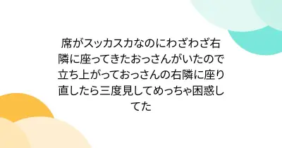 席がスッカスカなのにわざわざ右隣に座ってきたおっさんがいたので立ち上がっておっさんの右隣に座り直したら三度見してめっちゃ困惑してた