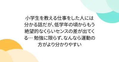 小学生を教える仕事をした人には分かる話だが、低学年の頃からもう絶望的なくらいセンスの差が出てくる… 勉強に限らず、なんなら運動の方がより分かりやすい
