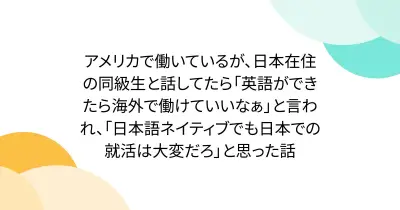アメリカで働いているが、日本在住の同級生と話してたら「英語ができたら海外で働けていいなぁ」と言われ、「日本語ネイティブでも日本での就活は大変だろ」と思った話