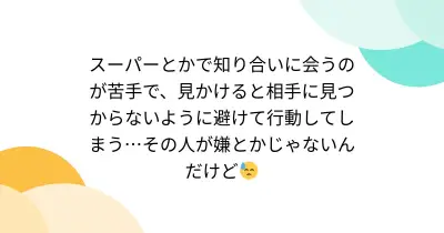 スーパーとかで知り合いに会うのが苦手で、見かけると相手に見つからないように避けて行動してしまう…その人が嫌とかじゃないんだけど😓