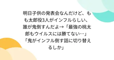 明日子供の発表会なんだけど、もも太郎役3人がインフルらしい、誰が鬼倒すんだよ→「最強の桃太郎もウイルスには勝てない…」「鬼がインフル倒す話に切り替えるしか」