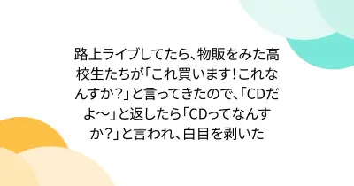 路上ライブしてたら、物販をみた高校生たちが「これ買います!これなんすか?」と言ってきたので、「CDだよ〜」と返したら「CDってなんすか?」と言われ、白目を剥いた