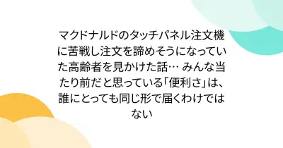 マクドナルドのタッチパネル注文機に苦戦し注文を諦めそうになっていた高齢者を見かけた話… みんな当たり前だと思っている「便利さ」は、誰にとっても同じ形で届くわけではない