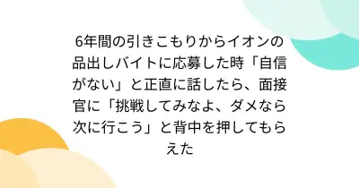 6年間の引きこもりからイオンの品出しバイトに応募した時「自信がない」と正直に話したら、面接官に「挑戦してみなよ、ダメなら次に行こう」と背中を押してもらえた