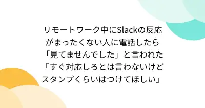 リモートワーク中にSlackの反応がまったくない人に電話したら「見てませんでした」と言われた「すぐ対応しろとは言わないけどスタンプくらいはつけてほしい」